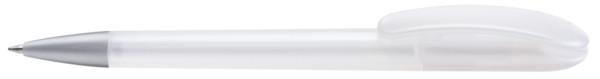 Drehkugelschreiber mit transparent gefrostetem Gehäuse. Schwere matt verchromte Metallspitze.