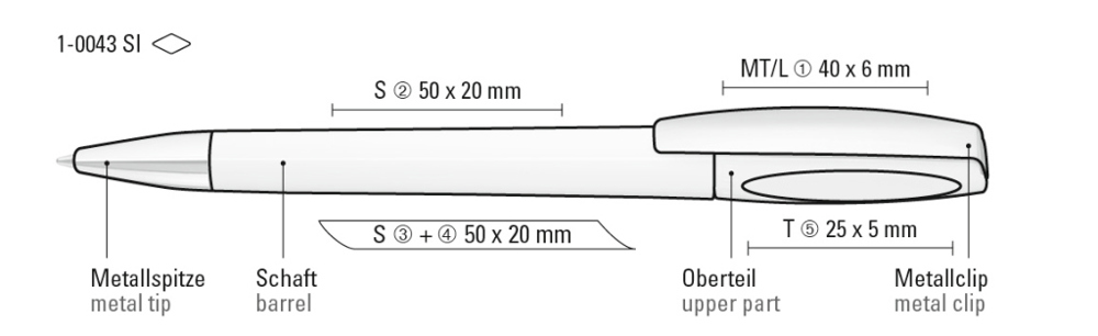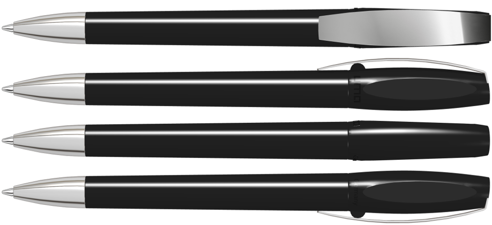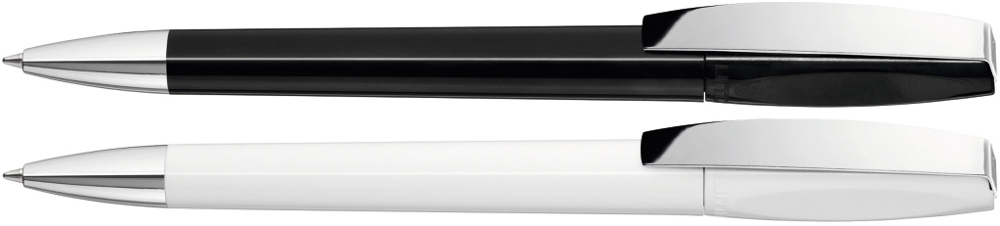 Drehkugelschreiber mit gedeckt glänzendem Gehäuse. Metallclip und schwere Metallspitze verchromt.