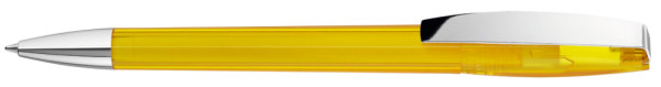 Drehkugelschreiber mit transparent glänzendem Gehäuse. Metallclip und schwere Metallspitze verchromt.