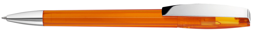 Drehkugelschreiber mit transparent glänzendem Gehäuse. Metallclip und schwere Metallspitze verchromt.