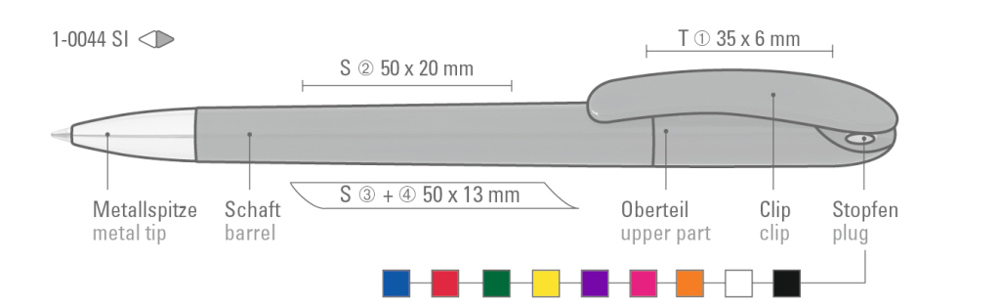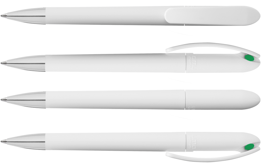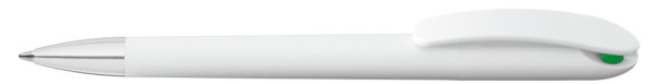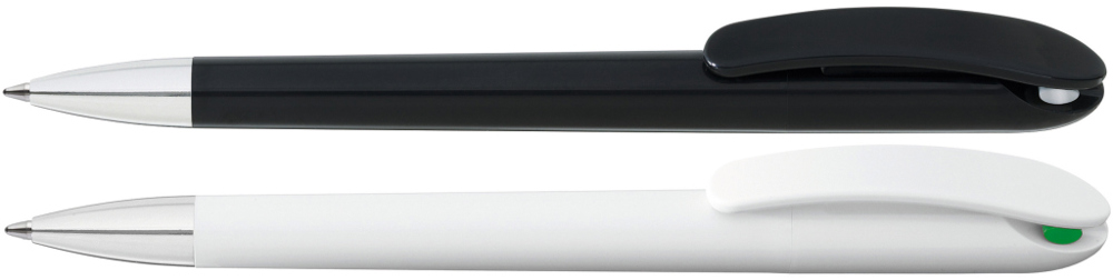 Drehkugelschreiber mit gedeckt glänzendem Gehäuse in schwarz oder weiß und farbigem Stopfen. Schwere Metallspitze glanzverchromt.