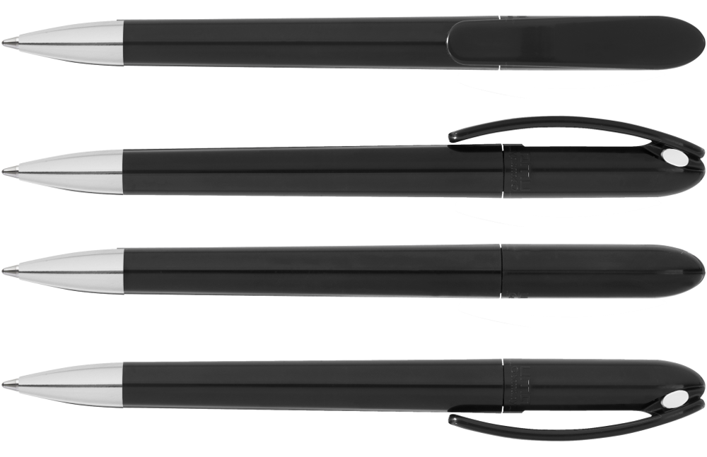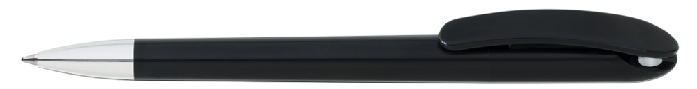 Drehkugelschreiber mit gedeckt glänzendem Gehäuse in schwarz oder weiß und farbigem Stopfen. Schwere Metallspitze glanzverchromt.