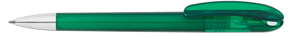Drehkugelschreiber mit transparent glänzendem Gehäuse und farbigem Stopfen. Schwere Metallspitze glanzverchromt.