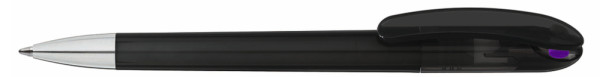 Drehkugelschreiber mit transparent glänzendem Gehäuse und farbigem Stopfen. Schwere Metallspitze glanzverchromt.