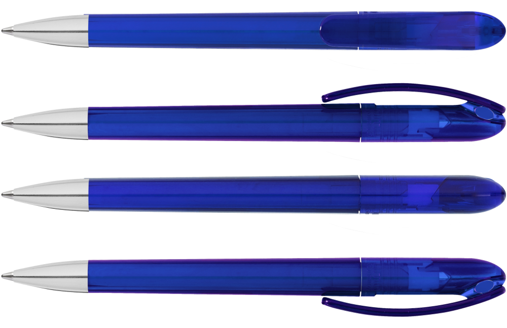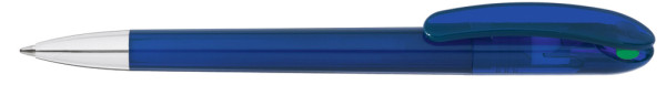 Drehkugelschreiber mit transparent glänzendem Gehäuse und farbigem Stopfen. Schwere Metallspitze glanzverchromt.