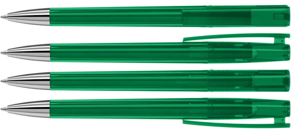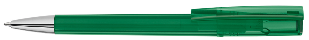 Drehkugelschreiber mit transparent glänzendem Gehäuse und silbernem Stopfen im Oberteil. Schwere Metallspitze glanzverchromt.