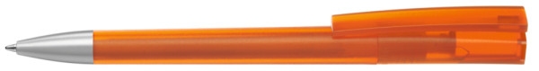 Drehkugelschreiber mit transparent gefrostetem Gehäuse und Stopfen optional in verschiedenen matt gedeckten Farben oder silber erhältlich. Schwere Metallspitze matt verchromt.