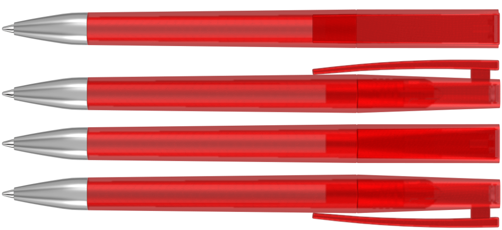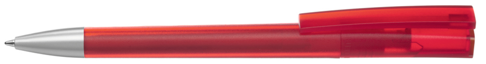 Drehkugelschreiber mit transparent gefrostetem Gehäuse und Stopfen optional in verschiedenen matt gedeckten Farben oder silber erhältlich. Schwere Metallspitze matt verchromt.