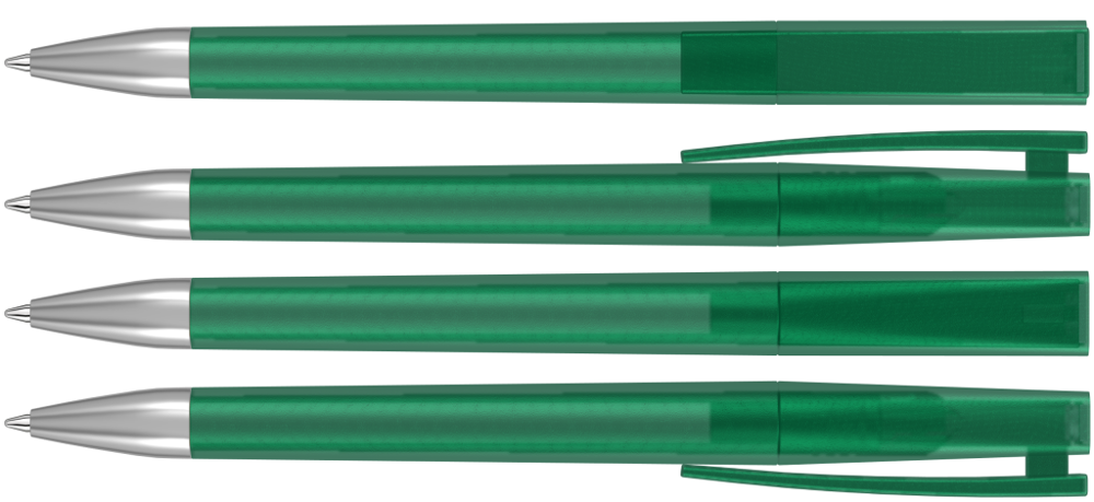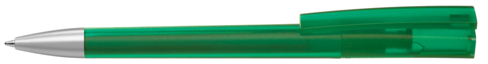 Drehkugelschreiber mit transparent gefrostetem Gehäuse und Stopfen optional in verschiedenen matt gedeckten Farben oder silber erhältlich. Schwere Metallspitze matt verchromt.