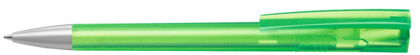 Drehkugelschreiber mit transparent gefrostetem Gehäuse und Stopfen optional in verschiedenen matt gedeckten Farben oder silber erhältlich. Schwere Metallspitze matt verchromt.