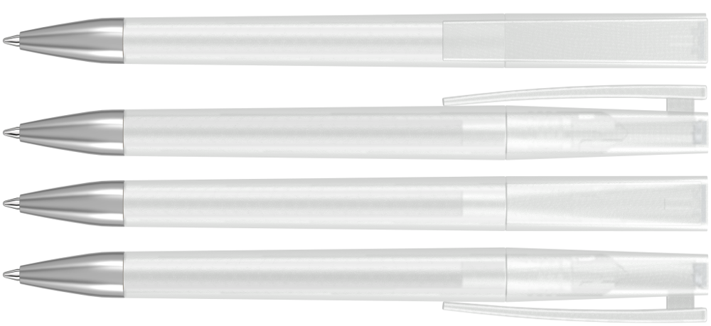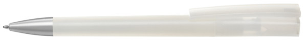 Drehkugelschreiber mit transparent gefrostetem Gehäuse und Stopfen optional in verschiedenen matt gedeckten Farben oder silber erhältlich. Schwere Metallspitze matt verchromt.