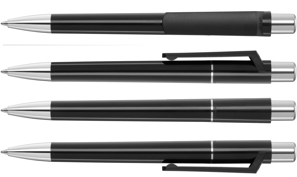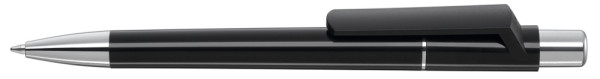 Druckkugelschreiber mit gedeckt glänzendem Gehäuse, Metallzierring, Drücker und schwere Metallspitze glanzverchromt.