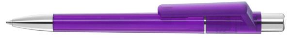 Druckkugelschreiber mit transparent glänzendem Gehäuse, Metallzierring, Drücker und schwere Metallspitze glanzverchromt.