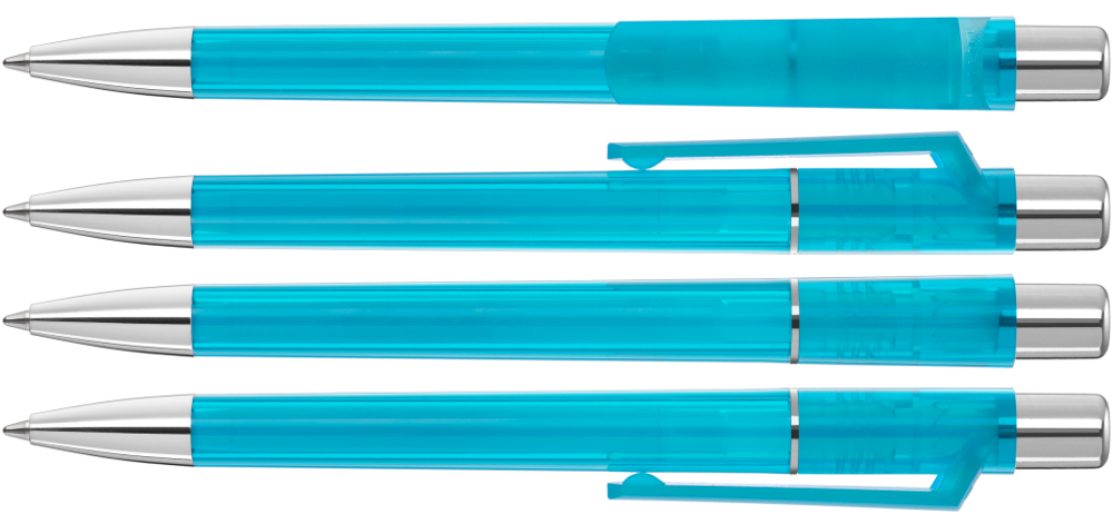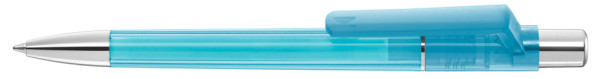 Druckkugelschreiber mit transparent glänzendem Gehäuse, Metallzierring, Drücker und schwere Metallspitze glanzverchromt.