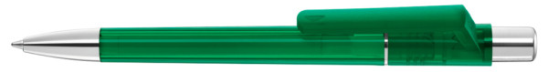 Druckkugelschreiber mit transparent glänzendem Gehäuse, Metallzierring, Drücker und schwere Metallspitze glanzverchromt.