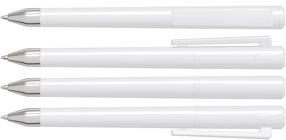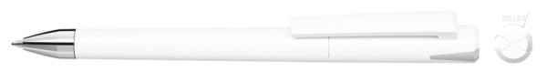 Drehkugelschreiber mit gedeckt glänzendem Gehäuse und Oberteil mit zwei farbigen Stopfen in gedeckt oder transparent. Schwere Metallspitze glanzverchromt.