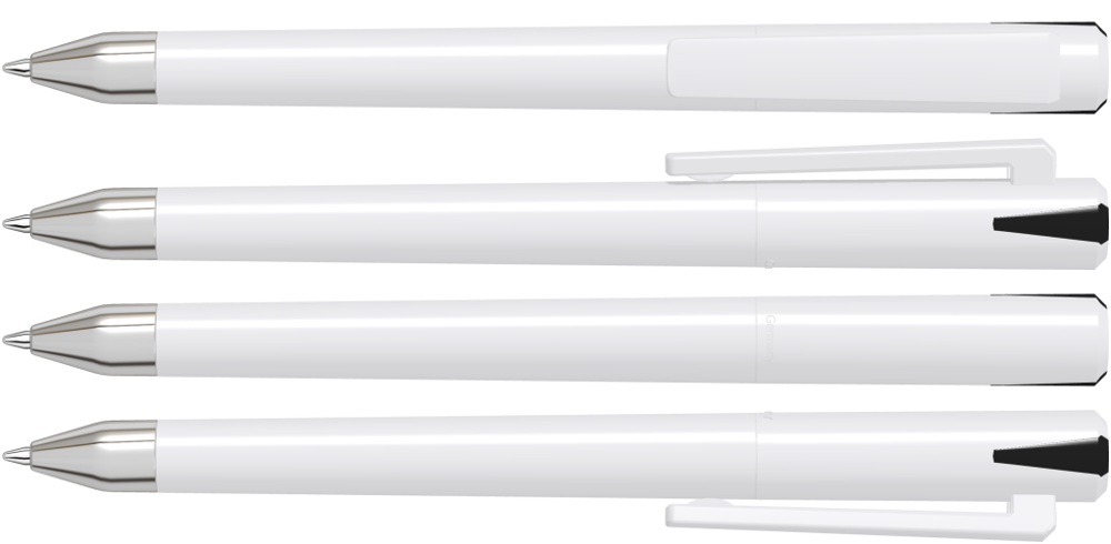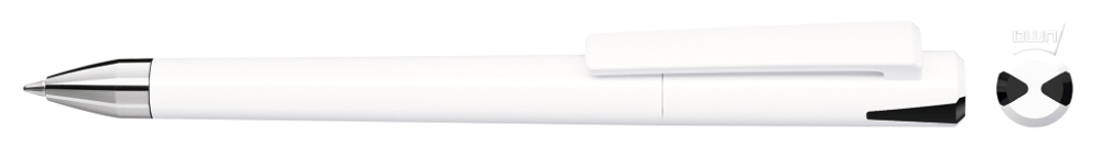 Drehkugelschreiber mit gedeckt glänzendem Gehäuse und Oberteil mit zwei farbigen Stopfen in gedeckt oder transparent. Schwere Metallspitze glanzverchromt.