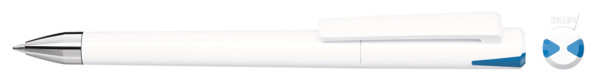 Drehkugelschreiber mit gedeckt glänzendem Gehäuse und Oberteil mit zwei farbigen Stopfen in gedeckt oder transparent. Schwere Metallspitze glanzverchromt.