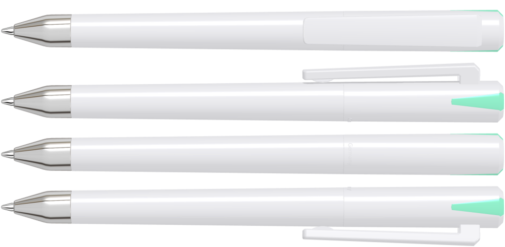 Drehkugelschreiber mit gedeckt glänzendem Gehäuse und Oberteil mit zwei farbigen Stopfen in gedeckt oder transparent. Schwere Metallspitze glanzverchromt.