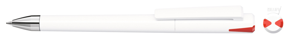 Drehkugelschreiber mit gedeckt glänzendem Gehäuse und Oberteil mit zwei farbigen Stopfen in gedeckt oder transparent. Schwere Metallspitze glanzverchromt.