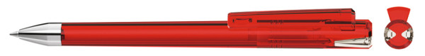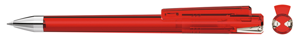 Drehkugelschreiber mit transparent glänzendem Gehäuse und Oberteil mit zwei farbigen Stopfen in gedeckt oder transparent glänzend. Schwere Metallspitze glanzverchromt.