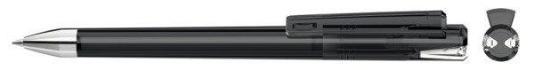 Drehkugelschreiber mit transparent glänzendem Gehäuse und Oberteil mit zwei farbigen Stopfen in gedeckt oder transparent glänzend. Schwere Metallspitze glanzverchromt.