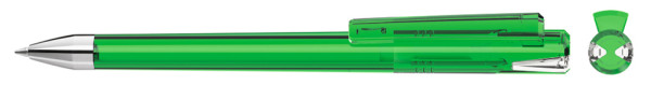 Drehkugelschreiber mit transparent glänzendem Gehäuse und Oberteil mit zwei farbigen Stopfen in gedeckt oder transparent glänzend. Schwere Metallspitze glanzverchromt.