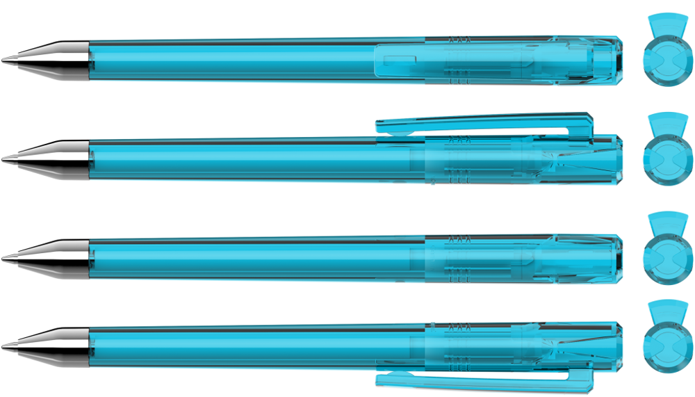 Drehkugelschreiber mit transparent glänzendem Gehäuse und Oberteil mit zwei farbigen Stopfen in gedeckt oder transparent glänzend. Schwere Metallspitze glanzverchromt.