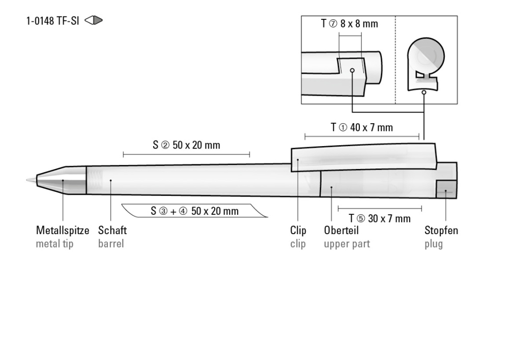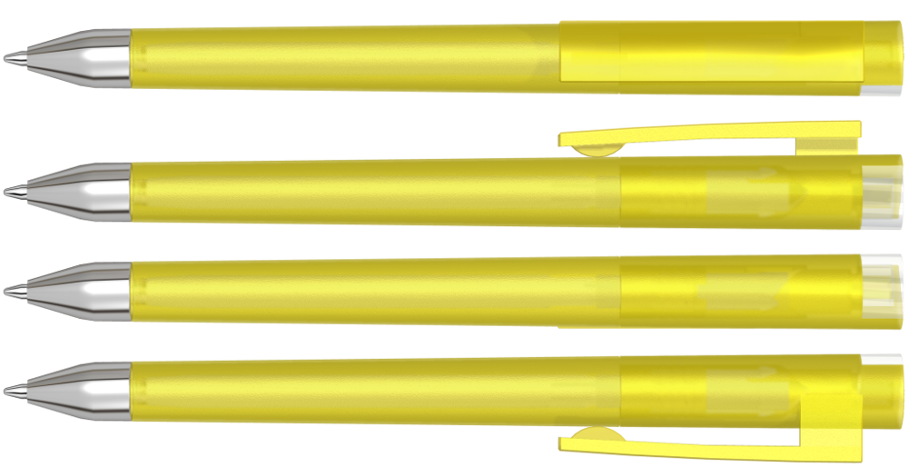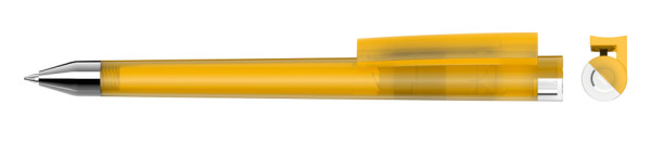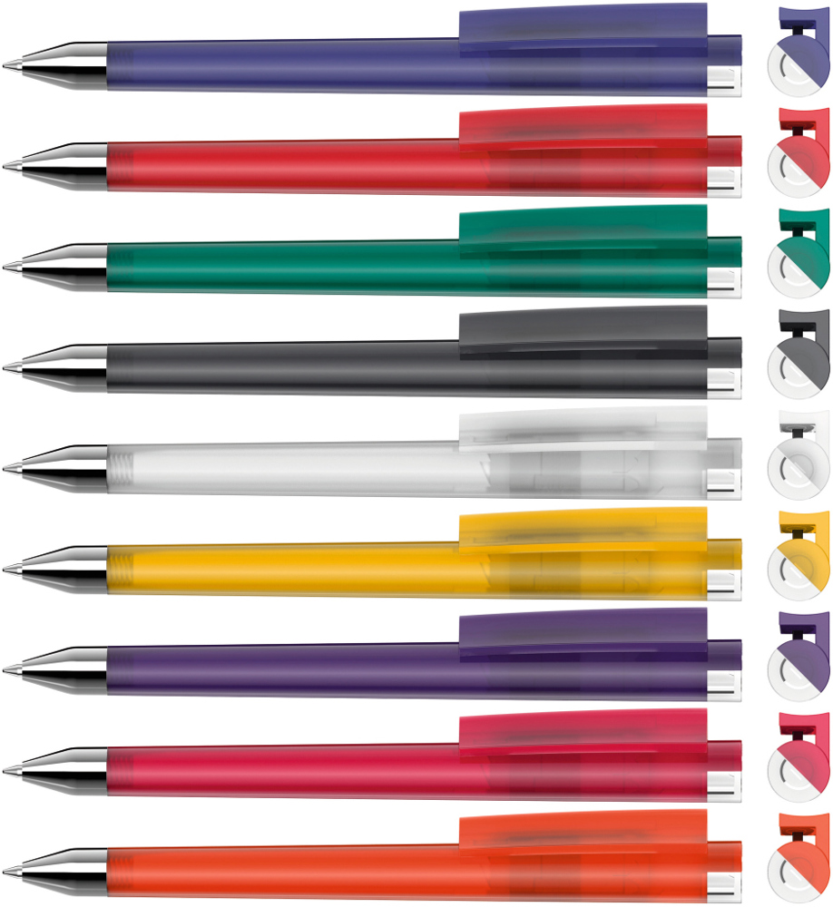 Drehkugelschreiber mit gefrostetem Gehäuse, Clip und Stopfen im Oberteil gedeckt glänzend bzw. transparent glänzend. Schwere Metallspitze glanzverchromt.