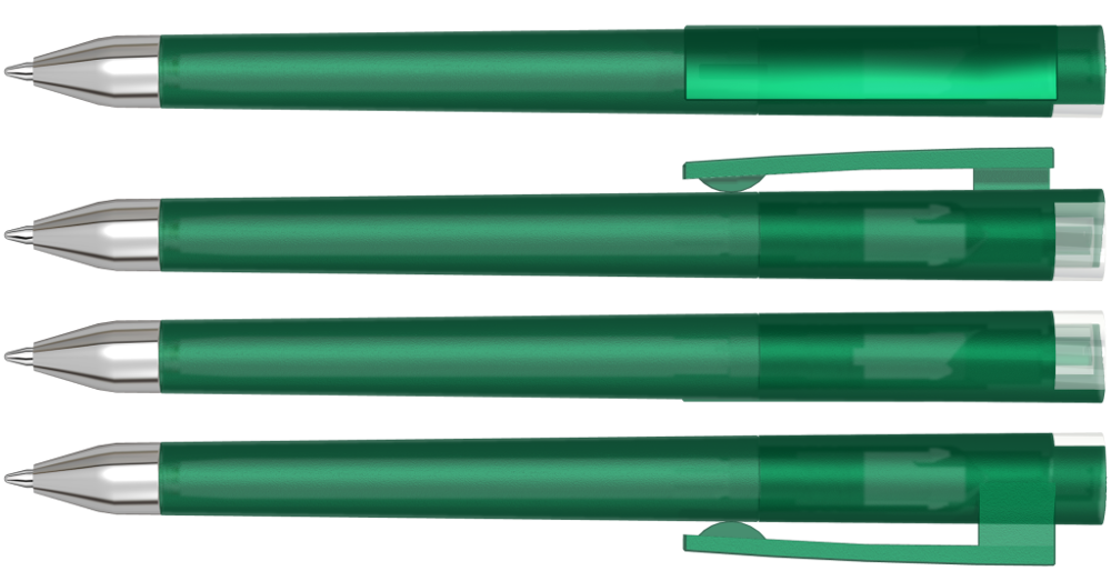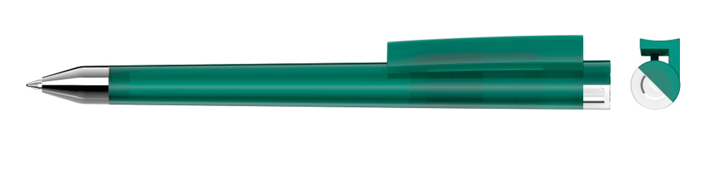 Drehkugelschreiber mit gefrostetem Gehäuse, Clip und Stopfen im Oberteil gedeckt glänzend bzw. transparent glänzend. Schwere Metallspitze glanzverchromt.