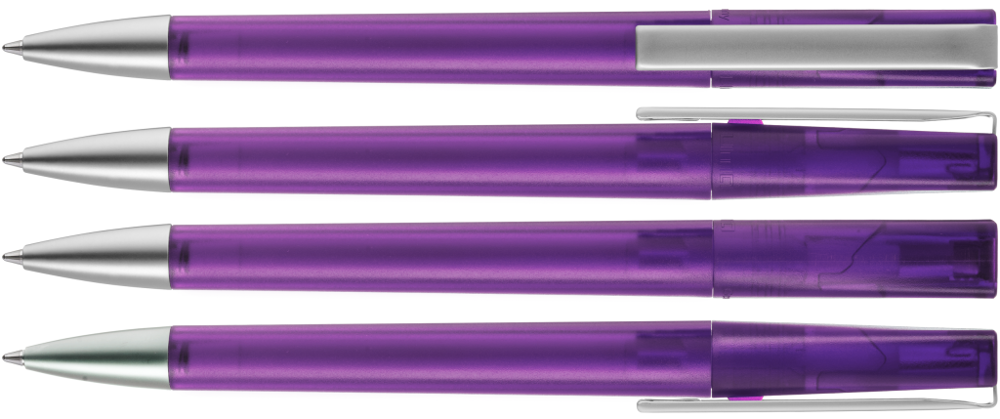 Drehkugelschreiber mit transparent gefrostetem Gehäuse, schwere Metallspitze und Metallclip matt verchromt.