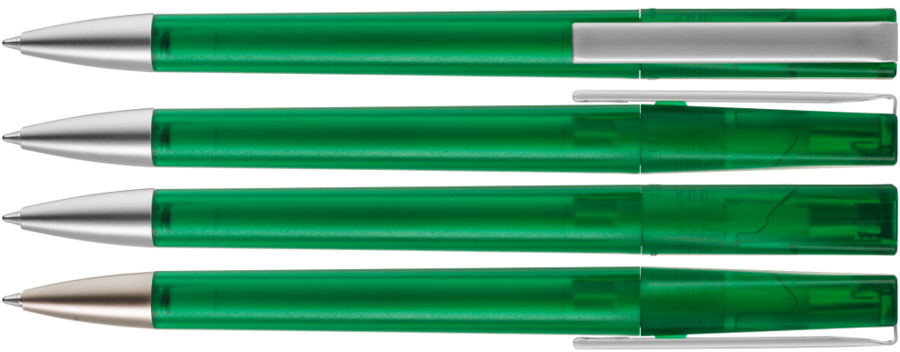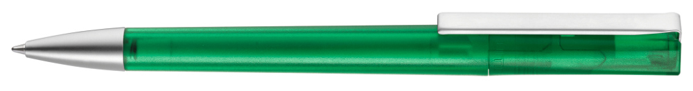 Drehkugelschreiber mit transparent gefrostetem Gehäuse, schwere Metallspitze und Metallclip matt verchromt.