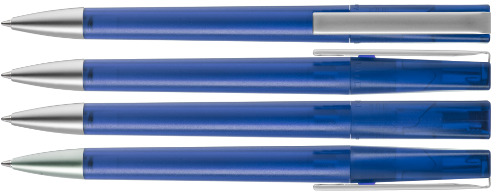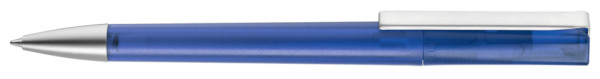 Drehkugelschreiber mit transparent gefrostetem Gehäuse, schwere Metallspitze und Metallclip matt verchromt.