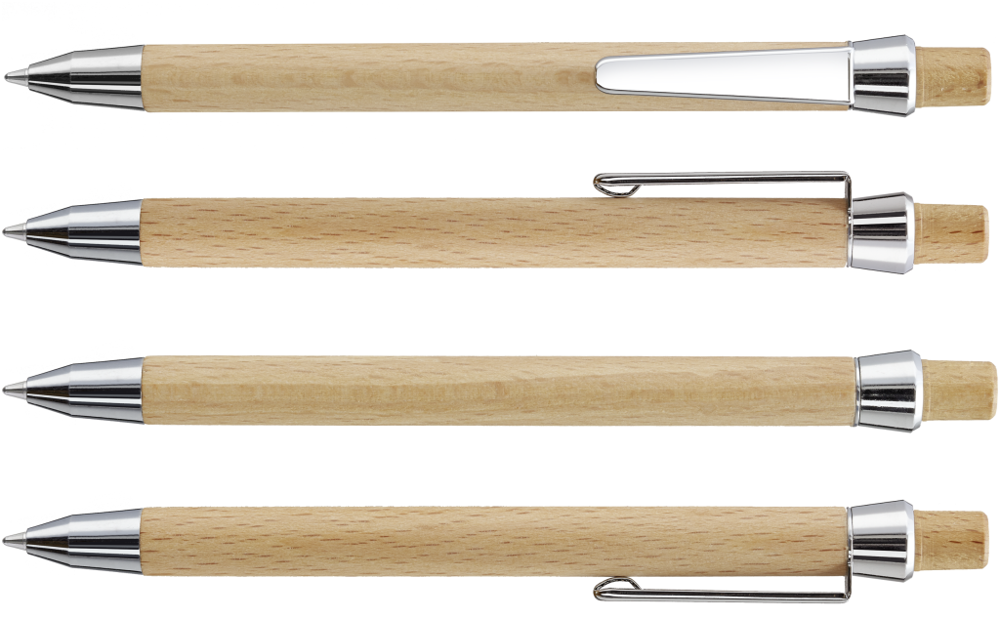 Holz-Druckkugelschreiber mit Holzdrücker, Metallclip und Metallspitze glanzverchromt. Schaft und Drücker aus schutzlackiertem PEFC-zertifiziertem Buchenholz.