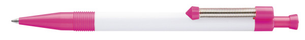 Druckkugelschreiber mit gedecktem Gehäuse und flexiblem und vernickeltem Metallfederclip.