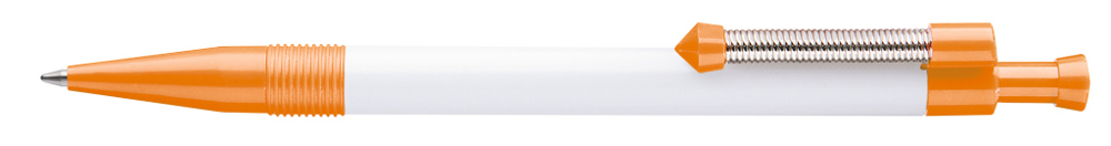 Druckkugelschreiber mit gedecktem Gehäuse und flexiblem und vernickeltem Metallfederclip.
