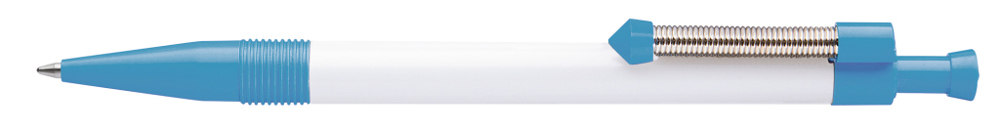Druckkugelschreiber mit gedecktem Gehäuse und flexiblem und vernickeltem Metallfederclip.