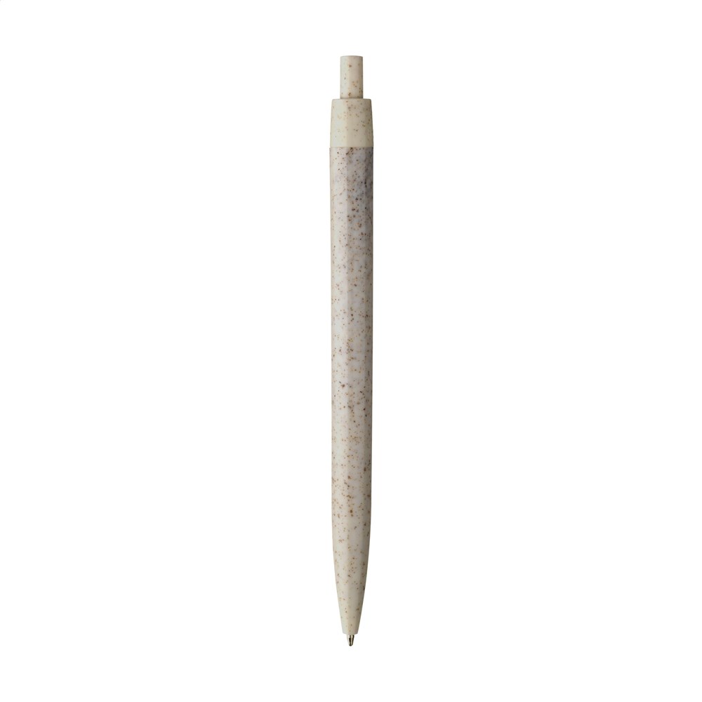 Blauschreibender Kugelschreiber, hergestellt aus 60% Weizenstroh und 40% Kunststoff. Griff, Clip und Druckknopf sind aus demselben Material gefertigt und der gesamte Kugelschreiber ist stilvoll in einer Farbe ausgeführt.
