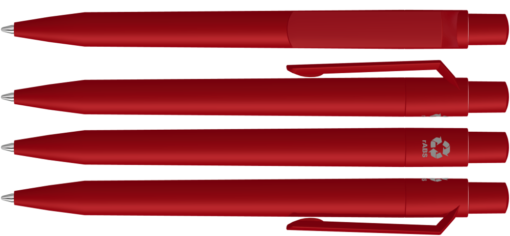 Druckkugelschreiber mit gedeckt mattem Gehäuse, Clip, Drücker und Stopfen aus recyceltem ABS-Kunststoff.