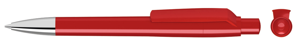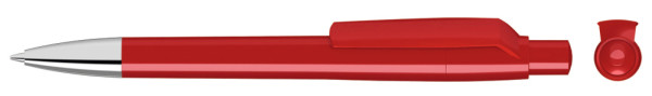 Druckkugelschreiber mit gedeckt glänzendem Gehäuse, Clip, Drücker und Stopfen. Spitze glanzverchromt.