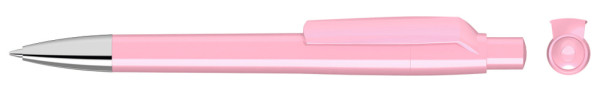 Druckkugelschreiber mit gedeckt glänzendem Gehäuse, Clip, Drücker und Stopfen. Spitze glanzverchromt.