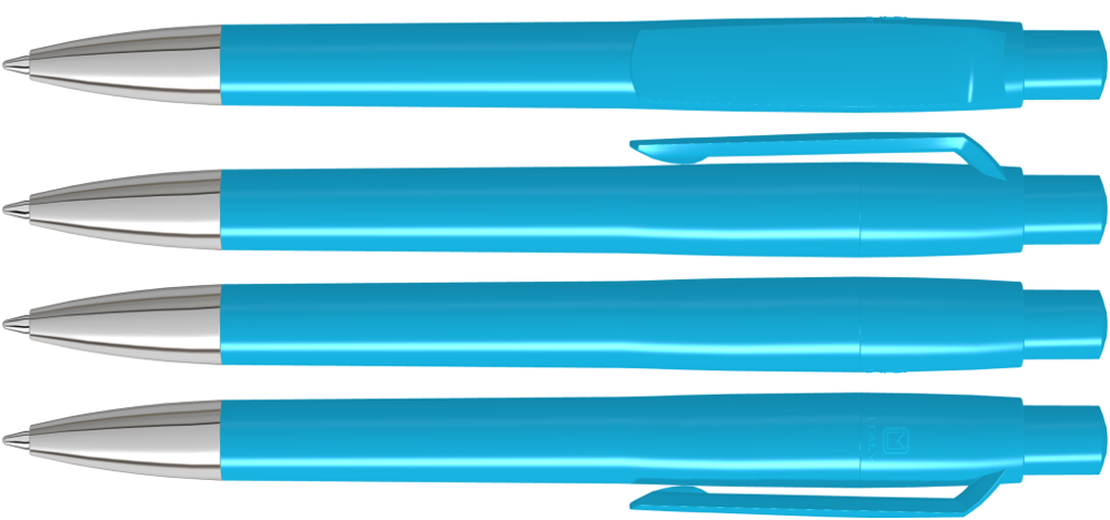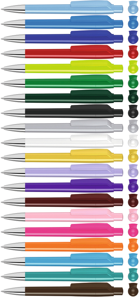 Druckkugelschreiber mit gedeckt glänzendem Gehäuse, Clip, Drücker und Stopfen. Spitze glanzverchromt.