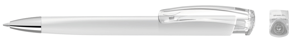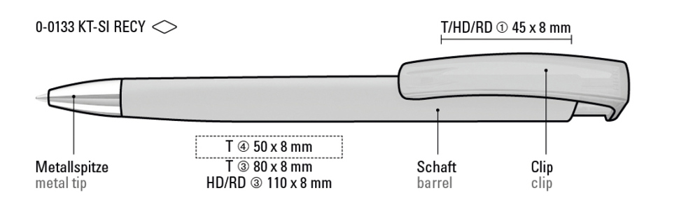 Druckkugelschreiber mit gedeckt mattem Dreikantgehäuse, transparent glänzendem Clip aus recyceltem ABS Kunststoff und schwerer Metallspitze glanzverchromt. Das Modell ist mit dem Recyclingzeichen gekennzeichnet.