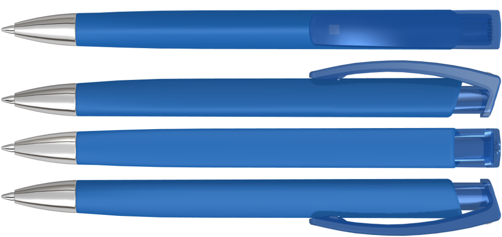 Druckkugelschreiber mit gedeckt mattem Dreikantgehäuse, transparent glänzendem Clip aus recyceltem ABS Kunststoff und schwerer Metallspitze glanzverchromt. Das Modell ist mit dem Recyclingzeichen gekennzeichnet.