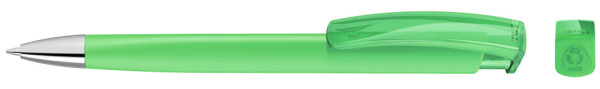 Druckkugelschreiber mit gedeckt mattem Dreikantgehäuse, transparent glänzendem Clip aus recyceltem ABS Kunststoff und schwerer Metallspitze glanzverchromt. Das Modell ist mit dem Recyclingzeichen gekennzeichnet.