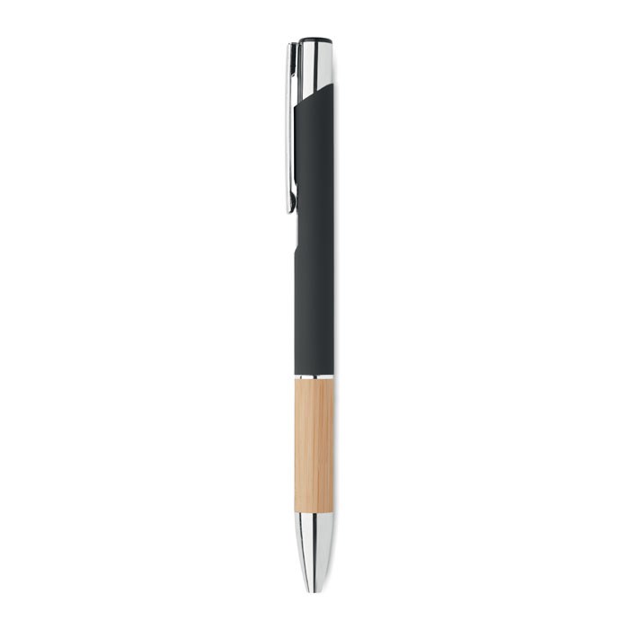 Druckkugelschreiber. Aluminium mit Griffteil aus Bambus. Blaue Tinte.
