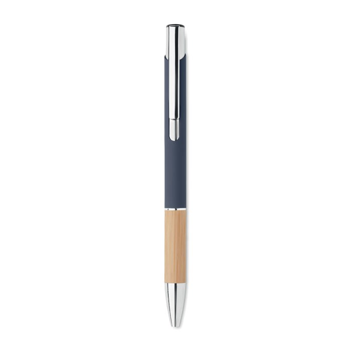 Druckkugelschreiber. Aluminium mit Griffteil aus Bambus. Blaue Tinte.