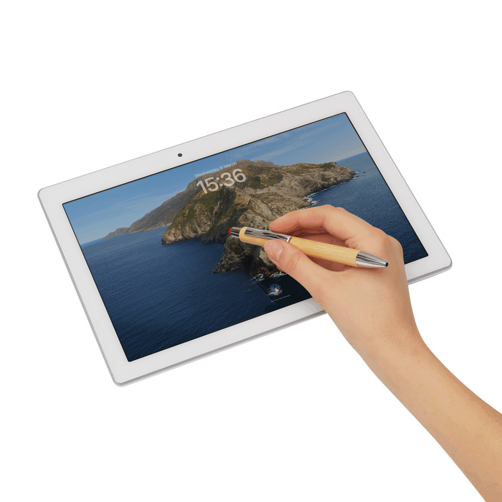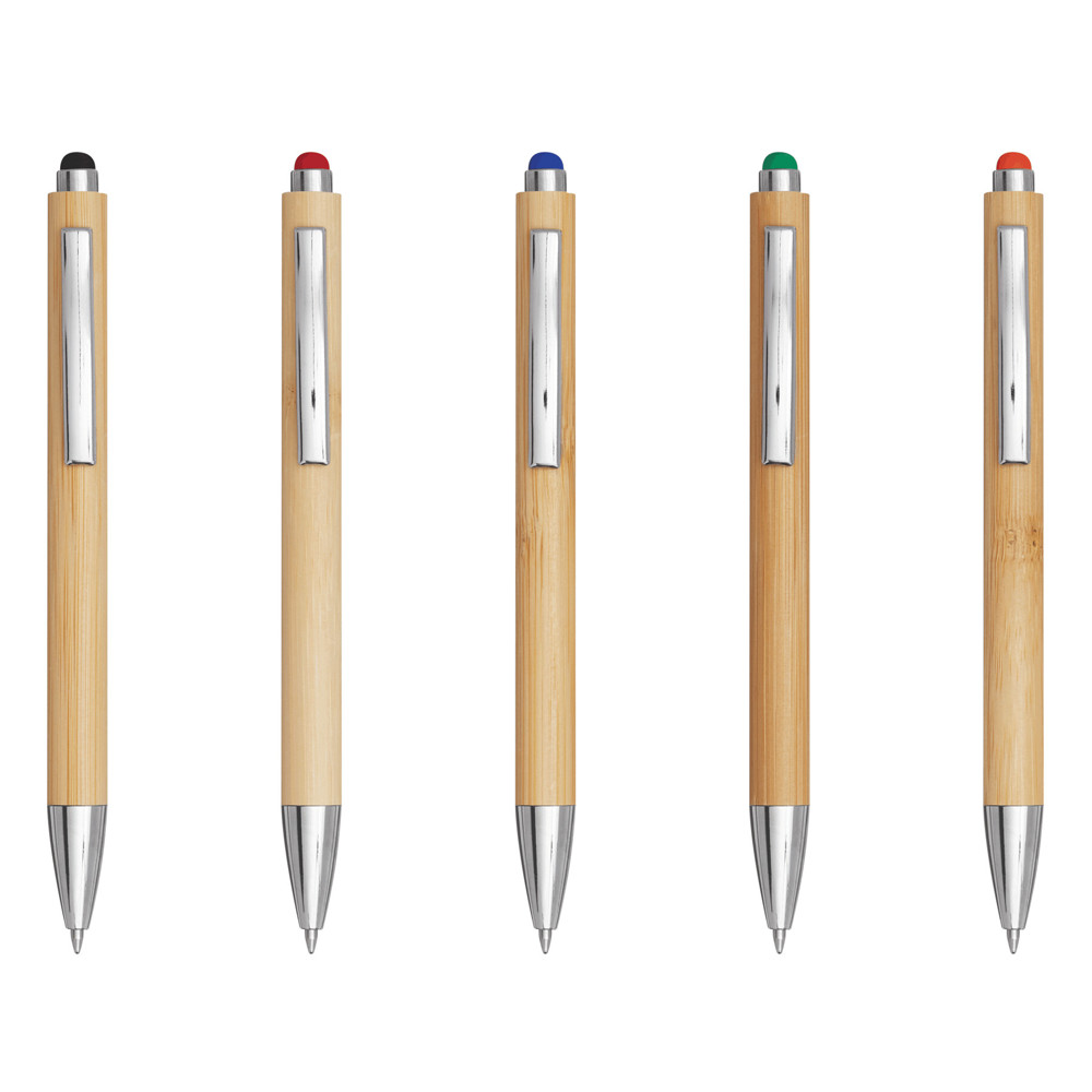 Kugelschreiber TOUCHY: mit elegantem Bambus-Schaft, Druckmechanismus, am Schaftende mit farbiger Touchscreen-Spitze, blauschreibend