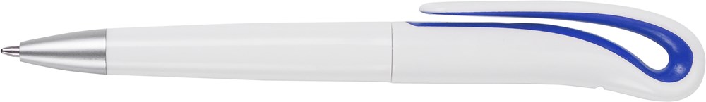 Drehkugelschreiber aus Kunststoff, weiß mit farbigen Akzenten und schwarzer Mine.