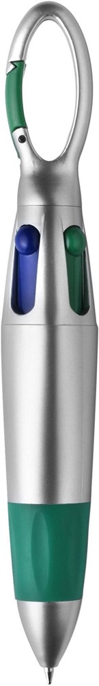 Kugelschreiber aus Kunststoff, mit farbigen Akzenten, 4 verschiedenen Minenfarben (schwarz, blau, grün, rot) und Karabinerhaken.